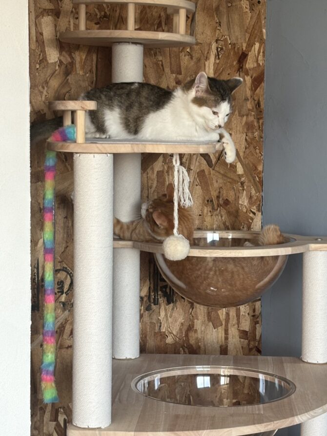 収納スペースを活用してキャットタワーを置けるようにしたのと、棚板を設置して上下運動できるようにしました。