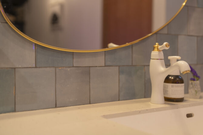 コーディネートのポイント 鏡と洗面台の間の「チャイルドミラー」と呼ばれる部分にタイルを貼るのが人気です。水はねを防ぎつつ、洗面所を華やかな空間に変えてくれます。